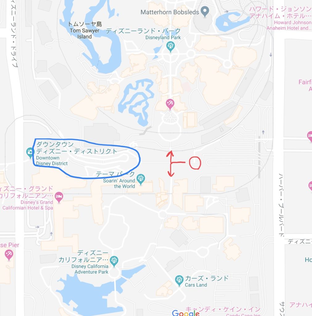 パークに入るだけなら今回利用したホテルがある東側は便利なんですが、ダウンタウンディズニーは青丸の範囲になります。