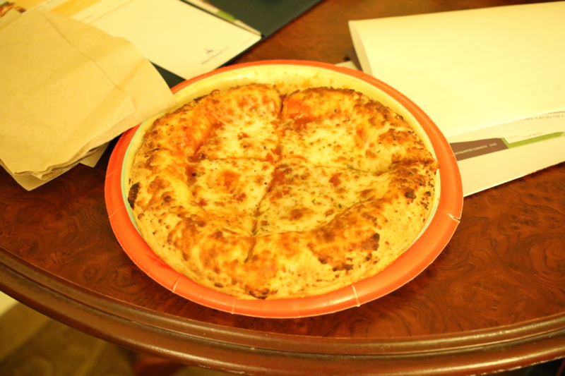 ペンネの上にフライドチキン、トマトソースにチーズ、一番上にはパンです。