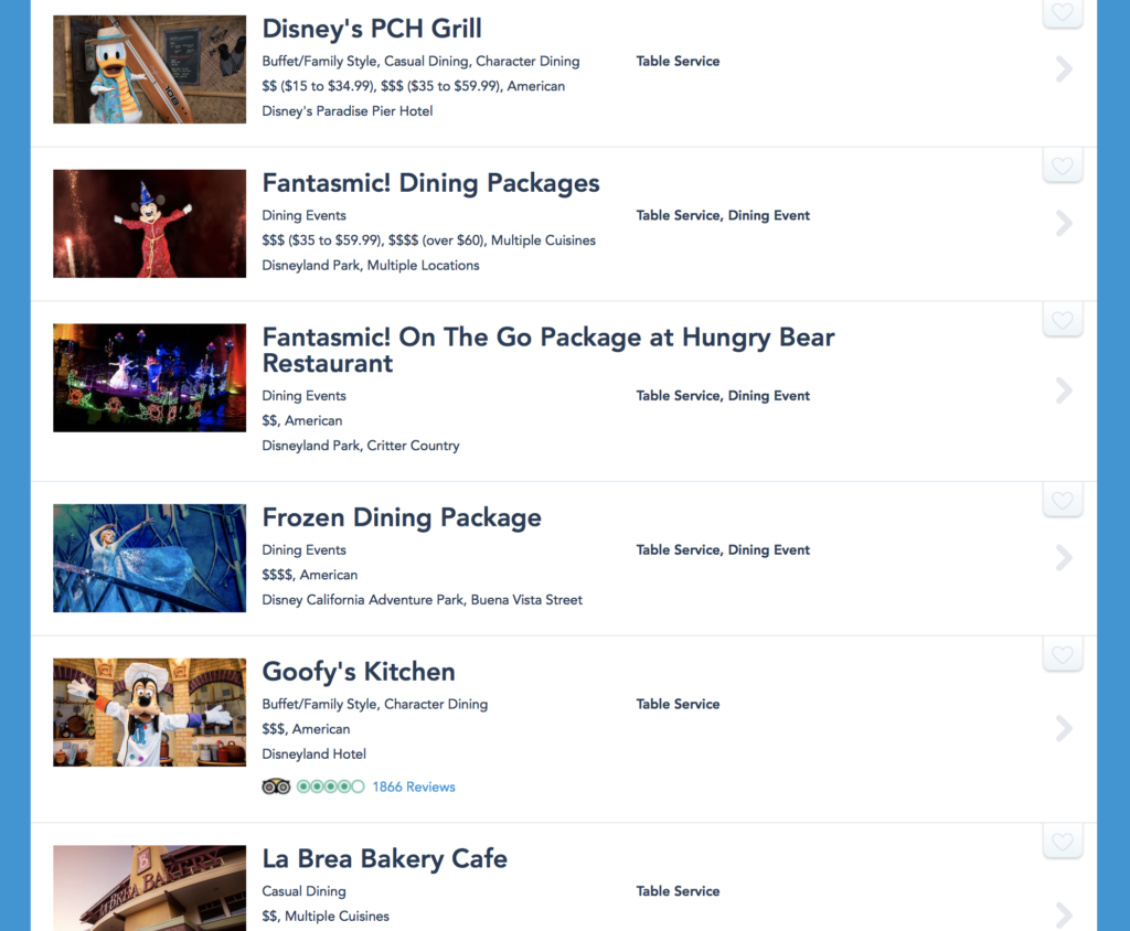 すると全てのパークとホテルのレストランが出てくるのでそこから絞り込みに入ります。
